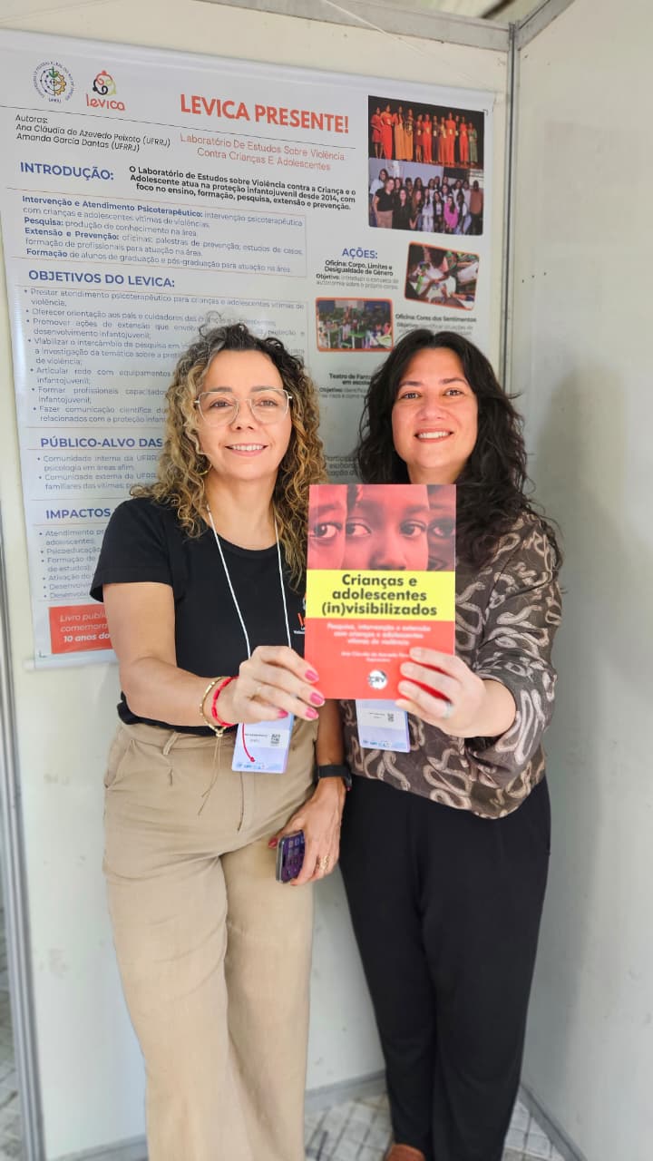 Durante a Mostra de Práticas em Psicologia, o painel “LEVICA presente!” destacou as ações desenvolvidas pelo laboratório na interface entre pesquisa, extensão e formação, com foco na defesa dos direitos de crianças e adolescentes e no enfrentamento das diversas formas de violência. Também foi apresentado o painel da oficina “Corpo, limites e desigualdade de gênero”, que evidenciou o trabalho de conscientização do público infantojuvenil sobre o direito ao próprio corpo, o reconhecimento de situações de violência, em especial a violência sexual, e a importância da denúncia como forma de enfrentamento.