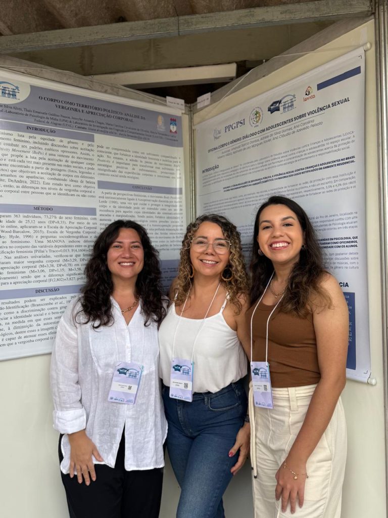 A coordenadora do Laboratório de Estudos sobre Violência contra Crianças e Adolescentes (LEVICA), Profª. Dra. Ana Cláudia Peixoto, ao lado das pesquisadoras Amanda Dantas (doutoranda) e Nathalia de Léo (mestranda), representou o laboratório na 55ª Reunião Anual da Sociedade Brasileira de Psicologia (SBP), realizada na Universidade Federal do Rio Grande do Norte (UFRN), em Natal.