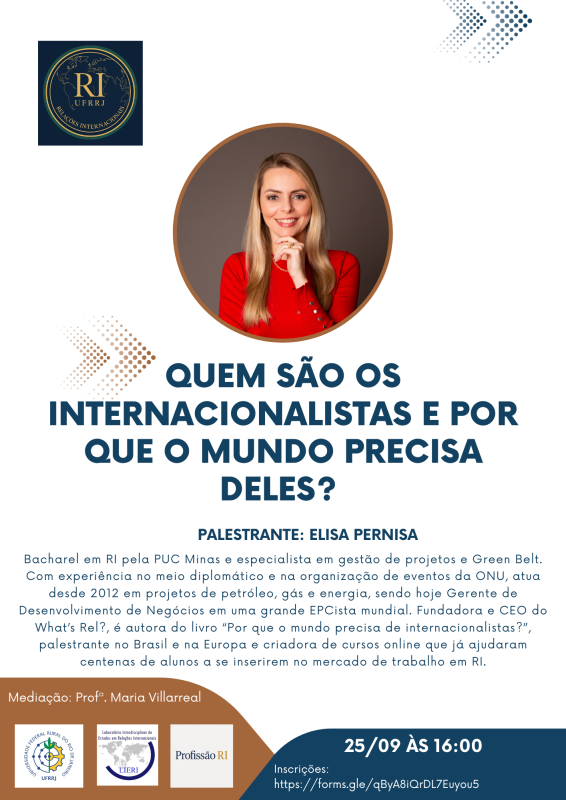 A palestra será ministrada por Elisa Pernisa, bacharel em Relações Internacionais pela PUC Minas, especialista em Gestão de Projetos e Green Belt. Com experiência no meio diplomático e na organização de eventos da ONU, atua desde 2012 em projetos de petróleo, gás e energia, sendo atualmente Gerente de Desenvolvimento de Negócios em uma das maiores EPCistas do mundo. Fundadora e CEO do What’s Rel?, é autora do livro “Por que o mundo precisa de internacionalistas?”, palestrante no Brasil e na Europa e criadora de cursos online que já ajudaram centenas de alunos a se inserirem no mercado de trabalho em RI.